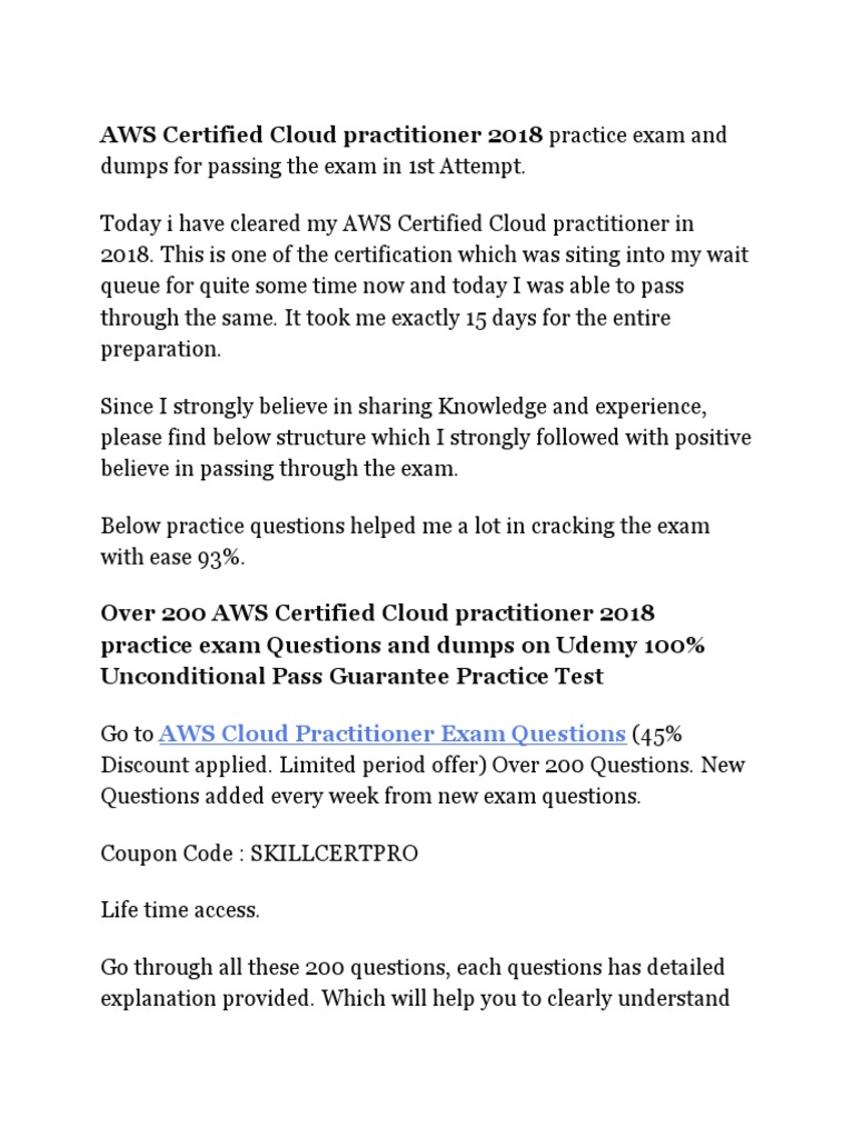 Answer 1 of 9. Exam question from Amazons AWS Certified Cloud Practitioner. After 3 weeks of study using the A Cloud Guru course and reading whitepapers I obtained my Certified Cloud Practitioner certification. Is there anyone thats taken the exam already any Udemy videos or course any pointers will be good. It may be an overkill but if you pass the Jon Bonso Certified Solutions Architect Associate practice tests then youll surely ace the Cloud Prac exam. Watch the AWS Cloud Practitioner Essentials. The AWS Free Digital Class roughly 45 hours to reinforce all the concepts above.